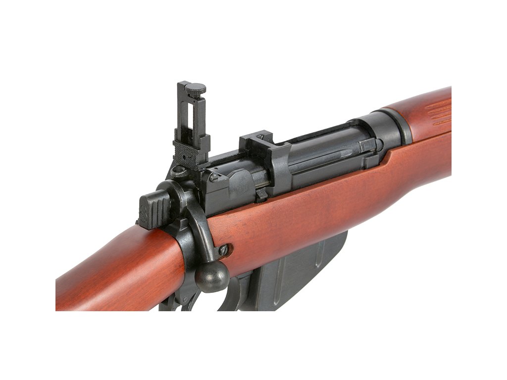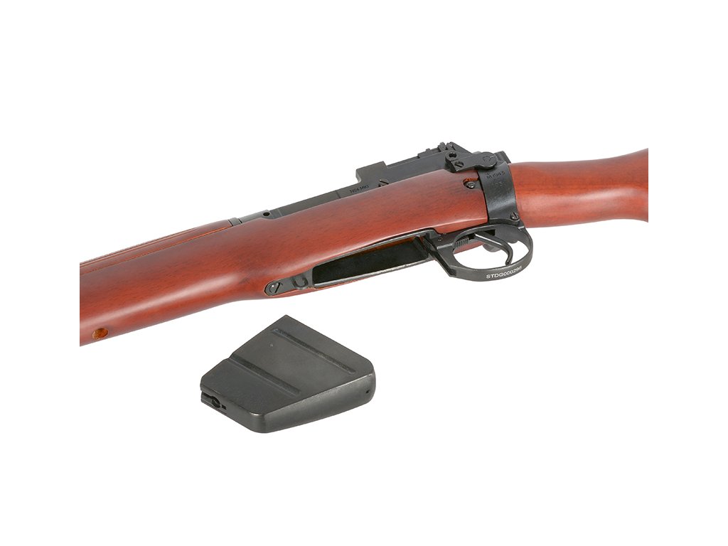 Lee-Enfield No.4 MK1 od S&T je airsoftová zbraň v měřítku 1:1 kultovní britské opakovací pušky z druhé světové války, vyrobená s mimořádnou péčí o detaily. Vybaven pažbou z vysoce kvalitního přírodního dřeva a odolnými kovovými prvky, kombinuje historickou přesnost s pevnou konstrukcí. Díky spolehlivému systému VSR10, přesné hlavni a ocelovému válci zajišťuje vynikající přesnost a výkon na delší vzdálenosti.