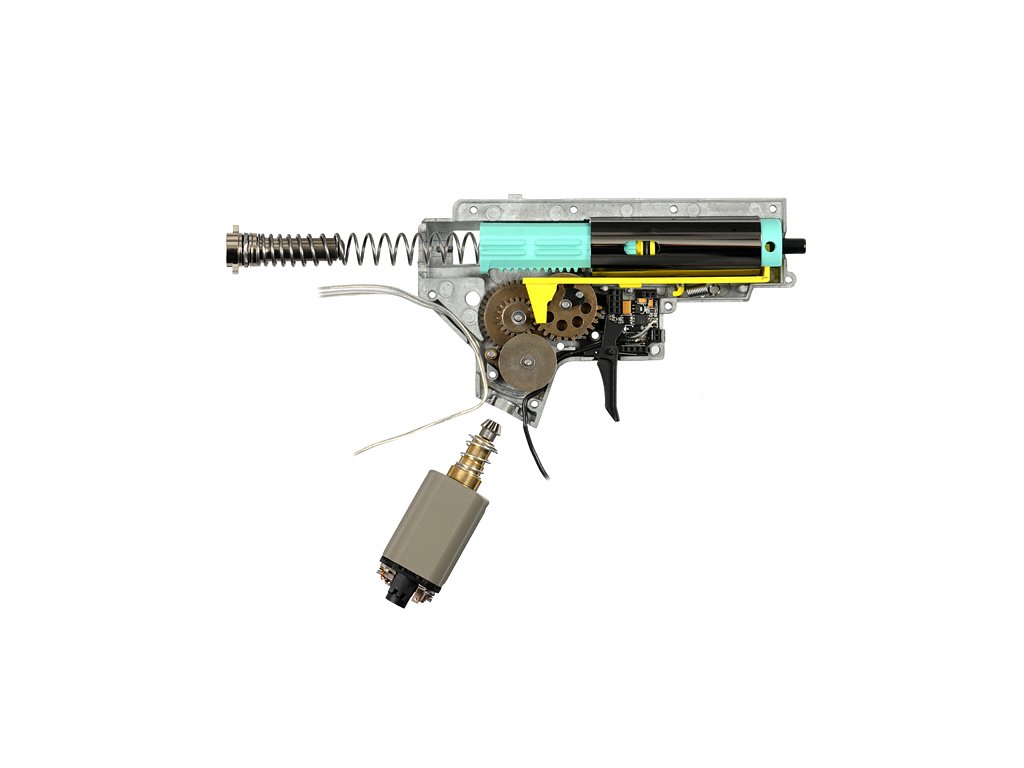 Zbraň je osazena gearboxem V2 s rychlým systémem výměny pružiny, který umožňuje okamžité přizpůsobení výkonu požadavkům hry. Vnitřní mechanismus je postaven na ocelových kolech v poměru 18:1, uložených v 8mm ložiskách, doplněných o ocelový válec. Díky této kombinaci pracuje zbraň plynule, spolehlivě a s dlouhou životností, a to i při dlouhodobé a intenzivní zátěži – ideální volba pro hráče, kteří očekávají opravdu stabilní výkon. Hybridní píst s nylonovou hlavou pístu zlepšuje utěsnění systému, zatímco rotační hop‑up komora umožňuje precizní nastavení, což se promítá ve zvýšeném dostřelu a lepší přesnosti. Poháněno motorkem 21K, který poskytuje rychlou odezvu spouště a stabilní výkon — ideální zbraň pro hráče hledající výkonnou, spolehlivou zbraň s velkým potenciálem.