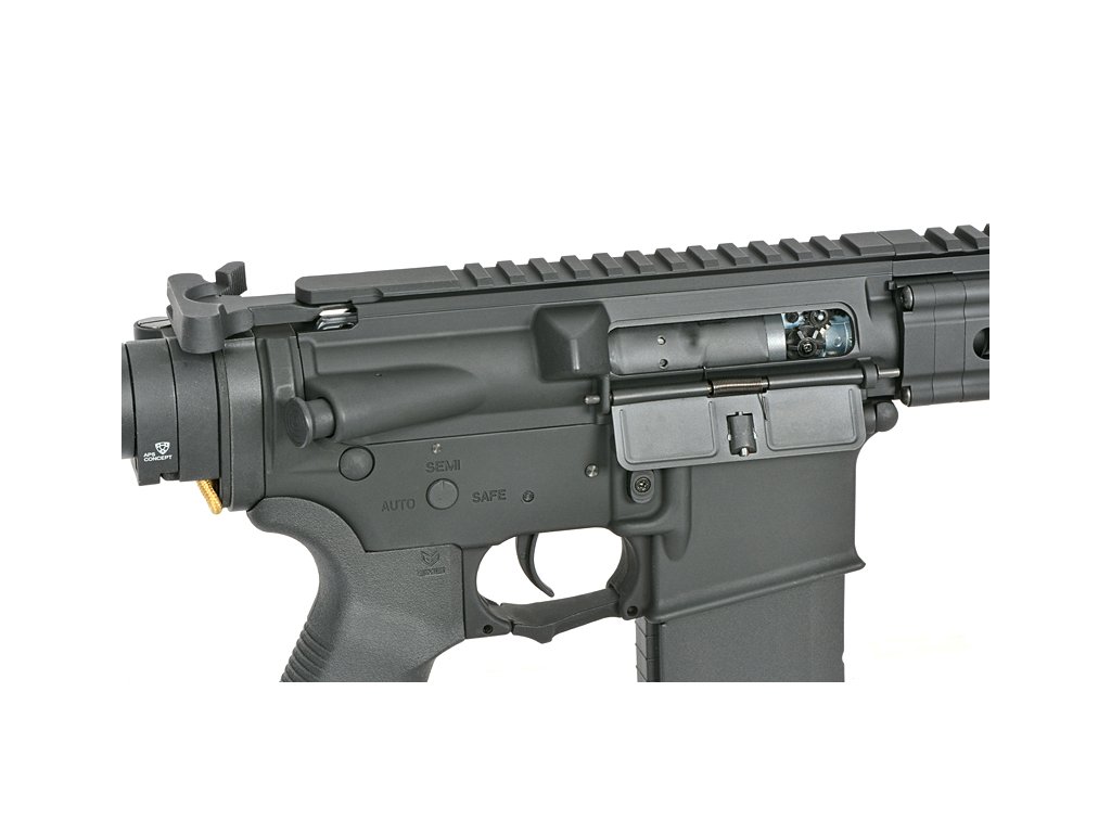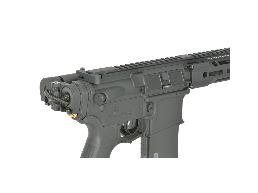 Oficiální označení Daniel Defense a ráže 5.56 dodávají zbrani autentický charakter a zdůrazňují její licencovaný status. Komfort používání zajišťují sklopná mířidla Hawk a ergonomická rukojeť EMG EPG Alpha, které zajišťují pevný úchop a přesné míření. Navíc detaily, jako je stříbrná spoušť, dodávají replice jedinečný charakter a zvyšují její estetiku.