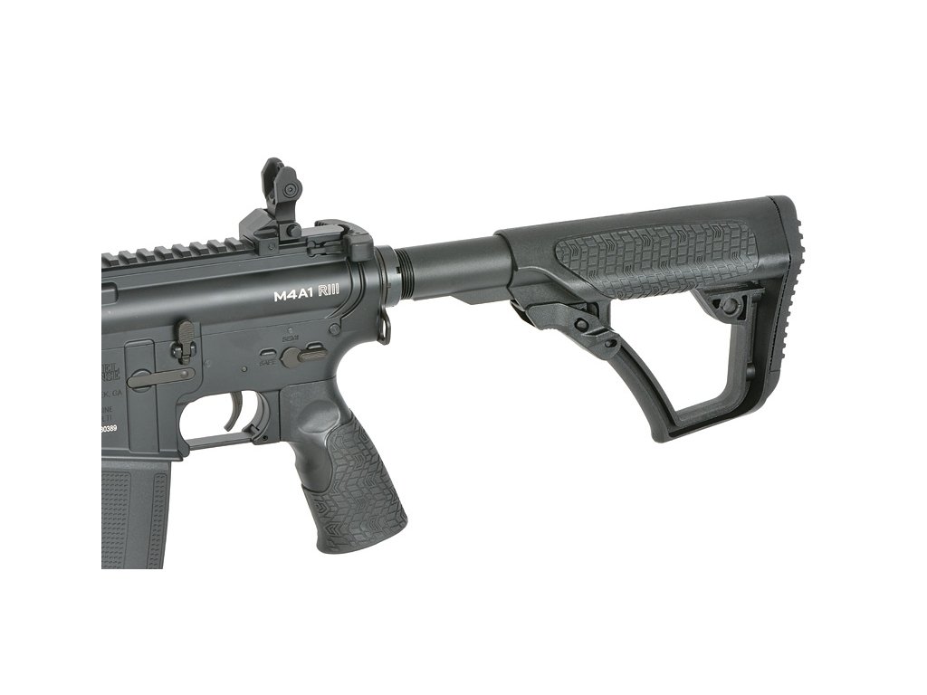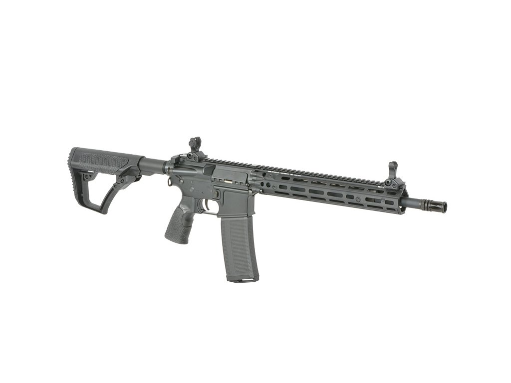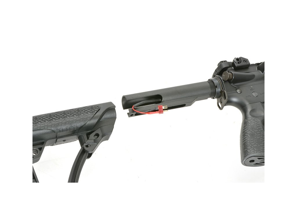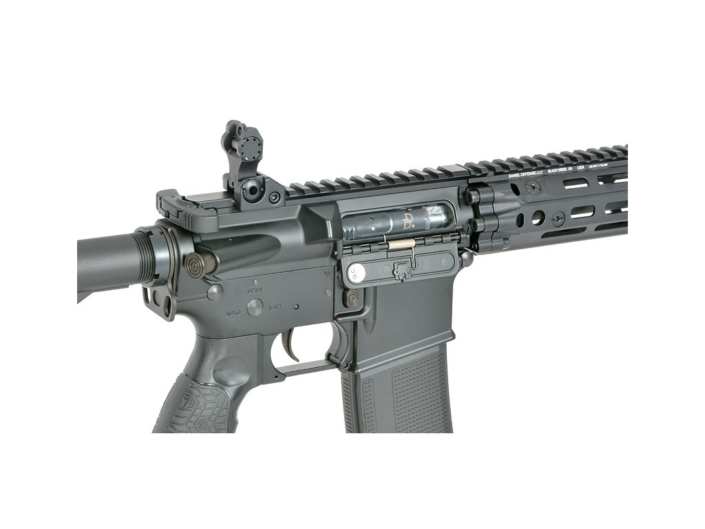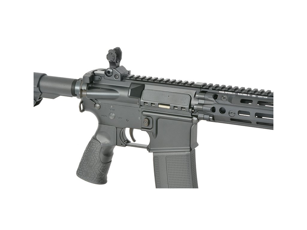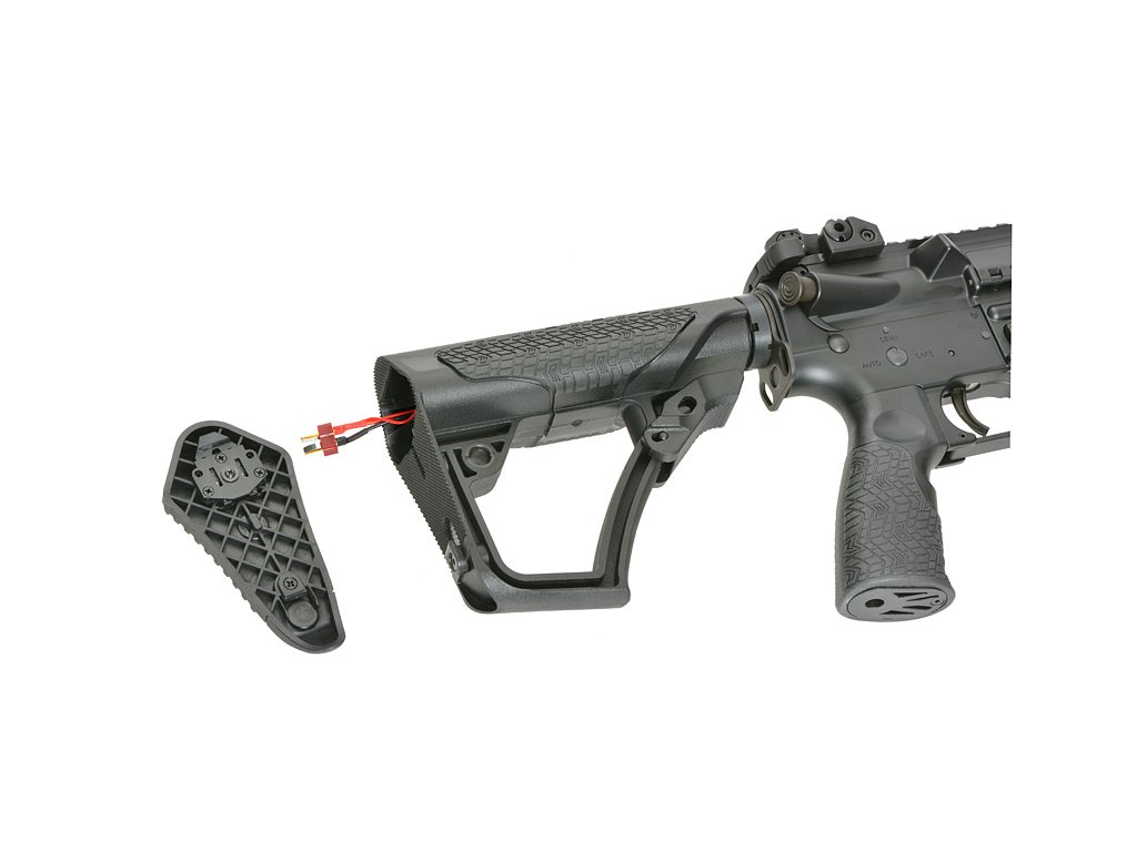 Tato puška, navržená s důrazem na detail, má také 6polohovou pažbu Daniel Defense s rychle odnímatelným krytem, který umožňuje snadný přístup k prostoru pro baterii. Tvarovaná pistolová rukojeť s agresivní texturou poskytuje ergonomické pohodlí a kontrolu během intenzivních bojů.