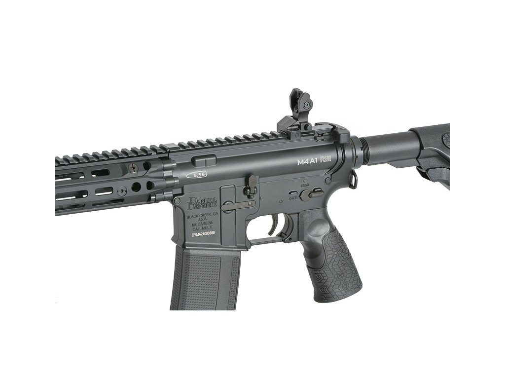Airsoftová zbraň Daniel Defense M4A1 RIII, licencovanou společností EMG a vyrobenou firmou CYMA, která kombinuje autentické označení a nejvyšší kvalitu provedení. Vybavená inovativním lišty RIS III, pokročilou elektronikou Eshooter ETU V2, kadencí 25 kuliček za sekundu a zesílenými díly, zajišťuje spolehlivost, přesnost a vynikající výkon za všech podmínek.