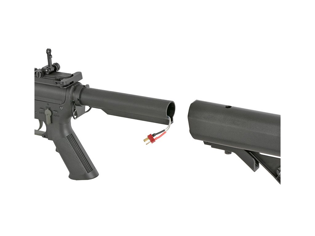 Nastavitelná pažba typu SF s 6-ti stupňovým nastavením ukrývá prostor pro akumulátor, což dělá konstrukci kompaktnější a praktičtější v terénu. Odnímatelný tlumič plamene odhaluje závit 14 mm levotočivý pro montáž kompatibilních koncových zařízení – jako jsou tlumiče zvuku nebo tlumiče plamene.