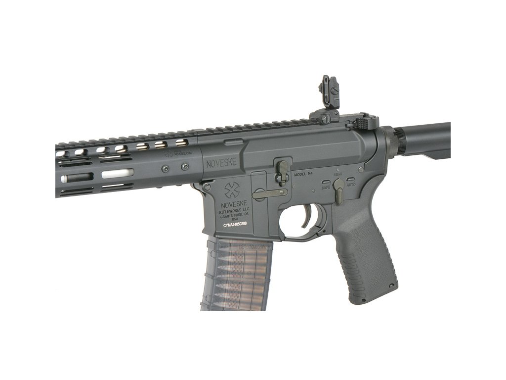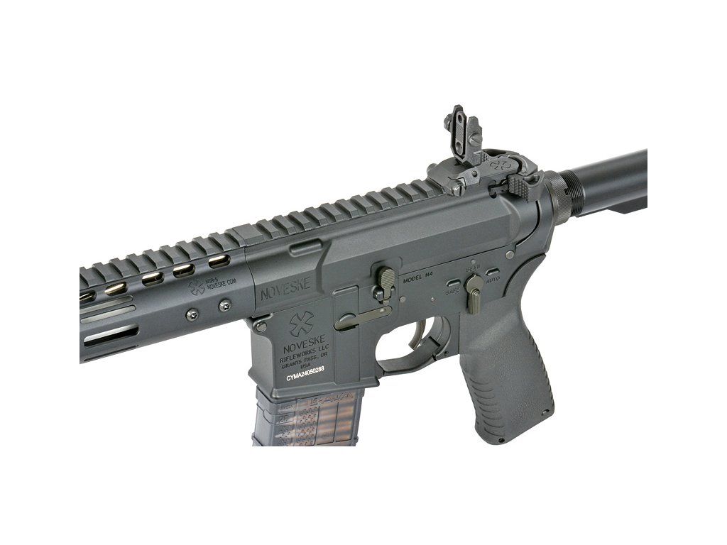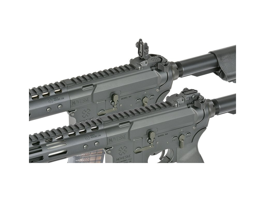 Plně kovové tělo nese realistická licencovaná označení Noveske na horním i spodním těle a předpažbí NSR‑9. Předpažbí v systému M‑LOK umožňuje snadnou montáž příslušenství, zatímco horní lišta Picatinny je připravena pro montáž optiky. QD úchyty na pažbě a zadní části těla zvyšují komfort při používání popruhu.