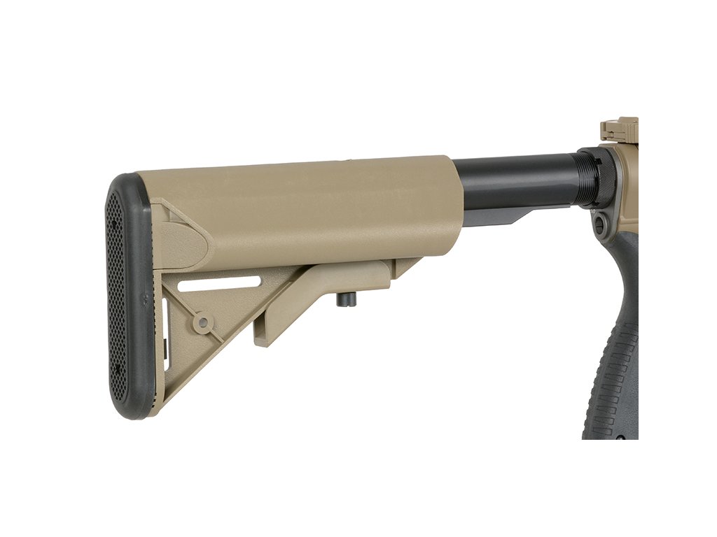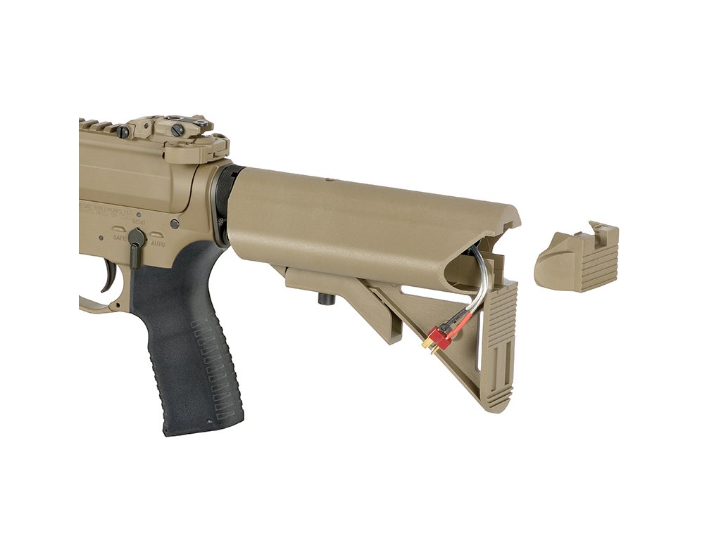 Součástí je nastavitelná 6polohová pažba, která umožňuje přizpůsobení délky podle potřeb uživatele. Ergonomická pistolová rukojeť zajišťuje pohodlný úchop a lepší kontrolu při střelbě. Zbraň je doplněna o licencovaný tlumič Noveske “Flaming Pig”.