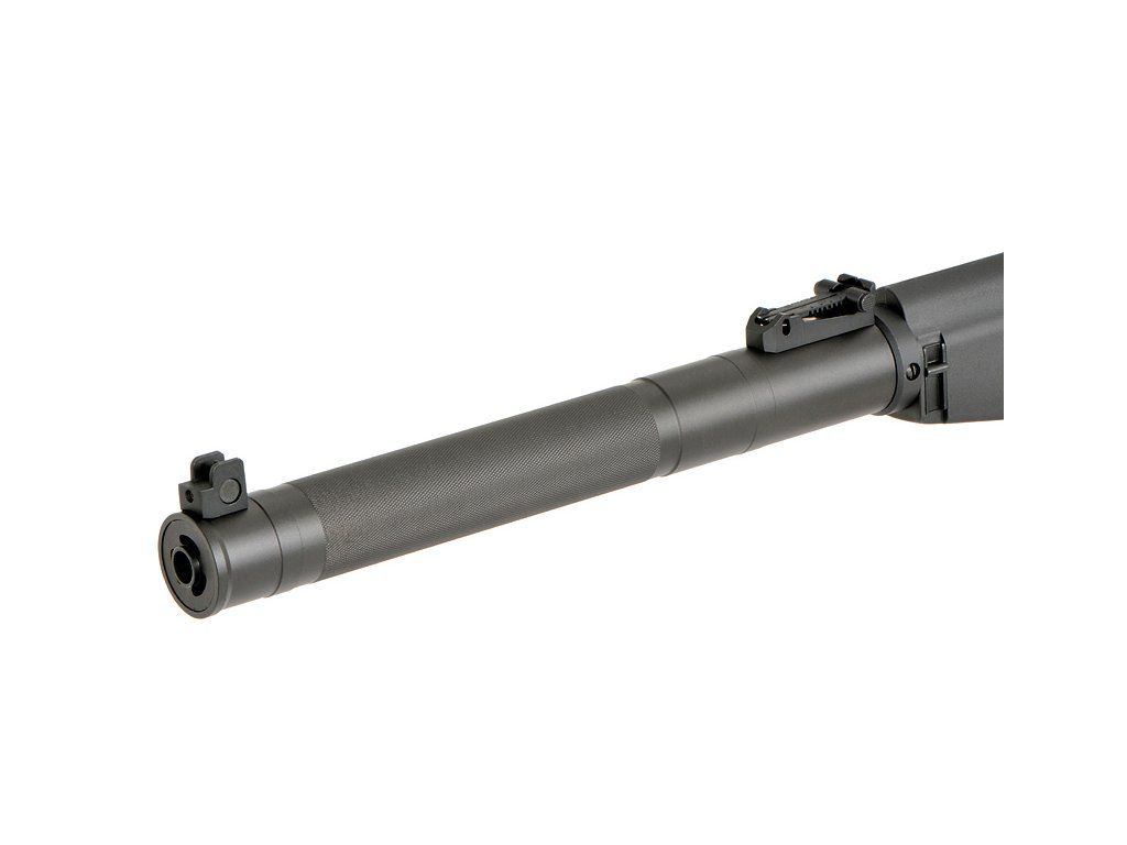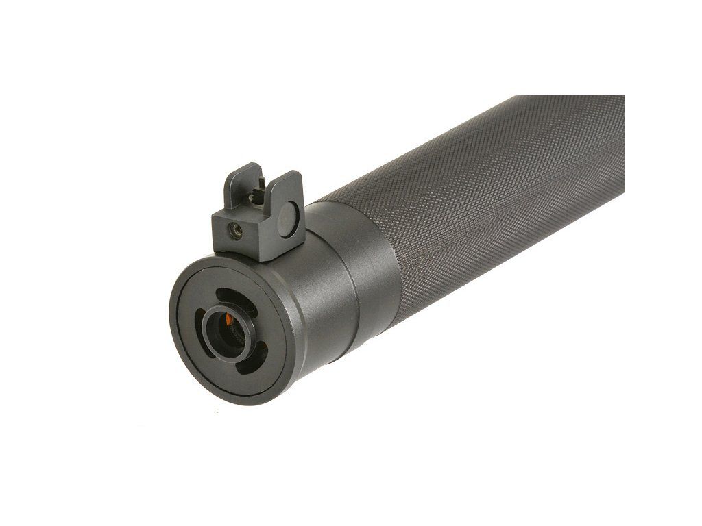 Zbraň kombinuje kovovou konstrukci s pravými dřevěnými prvky, což zajišťuje vysokou odolnost, realistický pocit při manipulaci a věrné zpracování originální zbraně. Charakteristický design s integrovaným tlumičem a boční montážní lištou pro optiku dělá z této zbraně ideální volbu pro tiché a přesné zásahy na střední vzdálenost.