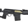 Elektrická replika nejnovější odstřelovací pušky SVD Dragunov. Ocelové části zbraně jsou přepínač režimu střelby, horní kryt, lučík, patka pažby a zásobník. Z hliníku jsou mířidla, tlumič plamene, vnější hlaveň, natahovací páka, plynové koleno, tělo zbraně. Předpažbí a pažbička s pevnou pažbou jsou polymerové. Akumulátor se vkládá do polymerového předpažbí zbraně.