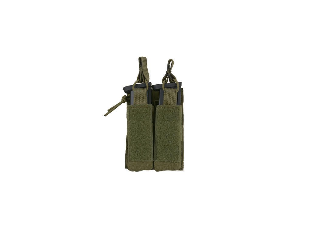 Tato otevřená dvojitá sumka je plně kompatibilní s Molle. Je vyrobena z velmi lehkého, odolného a nepromokavého materiálu. Každá kapsa je vybavena odtokovým otvorem. Gumové šňůrky zabraňují vypadnutí zásobníků a jsou plně nastavitelné pro zajištění zásobníku různých délek. Sumku lze použít nejen jako sumku na zásobníky, ale také jako kapsu na, svítilny, nože a dalšího příslušenství. Na vnější straně kapsy se nachází suchý zip, který vám umožní připojit další zařízení pomocí tohoto systému nebo jednoduše připevnit nášivku.