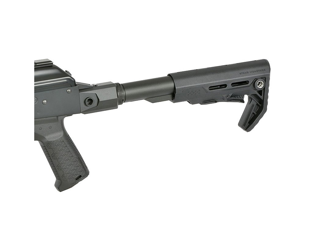 Strike Industries je americká firma, která se stala symbolem inovátorských řešení ve výrobě příslušenství ke střelným zbraním. V její nabídce se nachází mnoho vysoce kvalitního příslušenství, které zlepšuje výkon, ergonomii a odolnost. Firma se těší uznání jak profesionálů, tak i nadšenců do zbraní po celém světě. Díky licencovaným prvkům, jako je M-LOK předpažbí s RIS lištou, trn pažby AR-15 a pažba Strike MOD1, airsoftová zbraň AKS-74U zajišťuje nejvyšší kvalitu, funkčnost a estetiku.