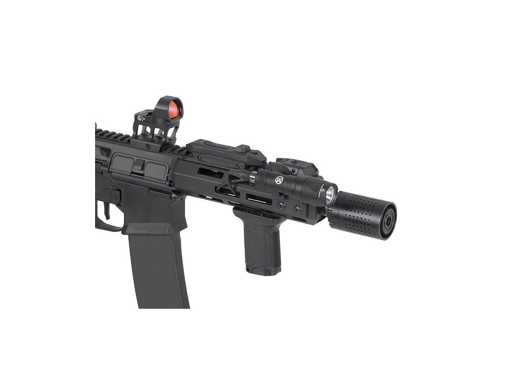 Vysoce kvalitní taktická svítilna V300 od společnosti WADSN. Vyrobena z eloxovaného hliníku, má Picatinny lištu a gelový spínač.